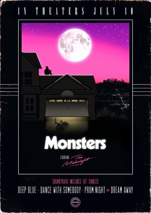 According to Tyler Lyle, a few that songs were written or sketched during the creation of Kids were held over for Monsters.[35] He also noted that the production of Monsters took longer than previous releases due to the band's tour schedule.[2][36][37] Monsters was released with fifteen tracks, the largest number to date on a The Midnight release. The title track is a collaboration with Jupiter Winter, a music duo consisting of Lelia Broussard and Royce Whittaker. Broussard co-wrote the track and sings vocals on the second verse. She had previously joined the band as a guitarist and backup vocalist during the Fall 2019 Tour. Broussard and Whittaker would both join The Midnight for the concert special The Midnight Online. Brooklyn, the album's eleventh track, was originally a solo song by Lyle from his album The Floating Years.[38]